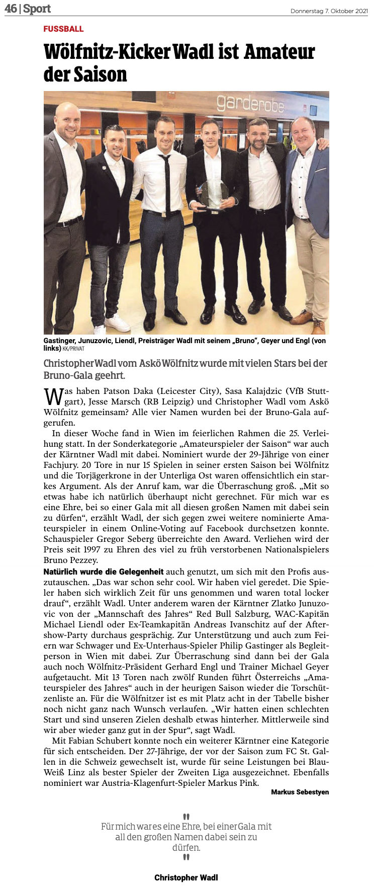 ...„Das war schon sehr cool. Wir haben viel geredet. Die Spieler haben sich wirklich Zeit für uns genommen und waren total locker drauf“, erzählt Wadl. Unter anderem waren der Kärntner Zlatko Junuzovic von der „Mannschaft des Jahres“ Red Bull Salzburg, WAC-Kapitän Michael Liendl oder Ex-Teamkapitän Andreas Ivanschitz auf der Aftershow-Party durchaus gesprächig. Zur Unterstützung und auch zum Feiern war Schwager und Ex-Unterhaus-Spieler Philip Gastinger als Begleitperson in Wien mit dabei. Zur Überraschung sind dann bei der Gala auch noch Wölfnitz-Präsident Gerhard Engl und Trainer Michael Geyer aufgetaucht. Mit 13 Toren nach zwölf Runden führt Österreichs „Amateurspieler des Jahres“ auch in der heurigen Saison wieder die Torschützenliste an."... (Quelle: Kleine Zeitung)